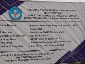 MediaGlobalisasi.com, Mojokerto – Pemerintah pusat melalui Direktorat SMK, Direktorat Jenderal Pendidikan Vokasi, Kementerian Pendidikan Dasar dan Menengah menyalurkan Bantuan Pemerintah Program Revitalisasi SMK Tahun 2025 kepada SMKS Thoriqul Ulum, Kabupaten Mojokerto, Jawa Timur.
